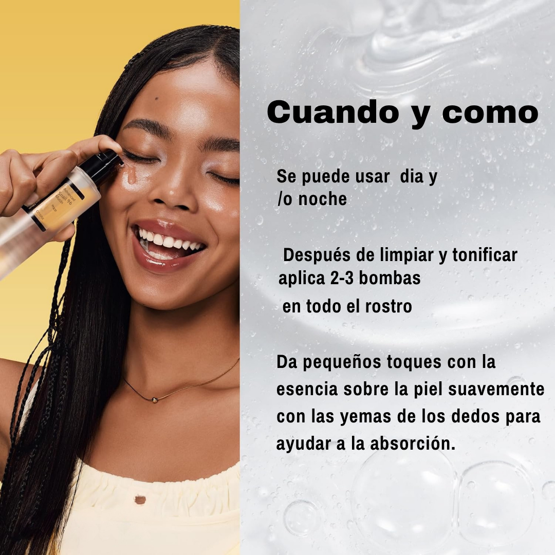 Esta esencia actúa como un multivitamínico para tu piel, aportando nutrientes que iluminan, unifican el tono y le dan un aspecto saludable y rejuvenecido. Tu piel nunca lucirá opaca ni cansada.